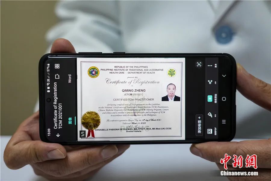 鄭啟明:2021年6月,菲律賓衛(wèi)生部授予我該國首張中醫(yī)執(zhí)業(yè)資格注冊證書,這標志著中醫(yī)在菲律賓獲得合法執(zhí)業(yè)資格,意味著中醫(yī)在菲未來的發(fā)展迎來新的契機。