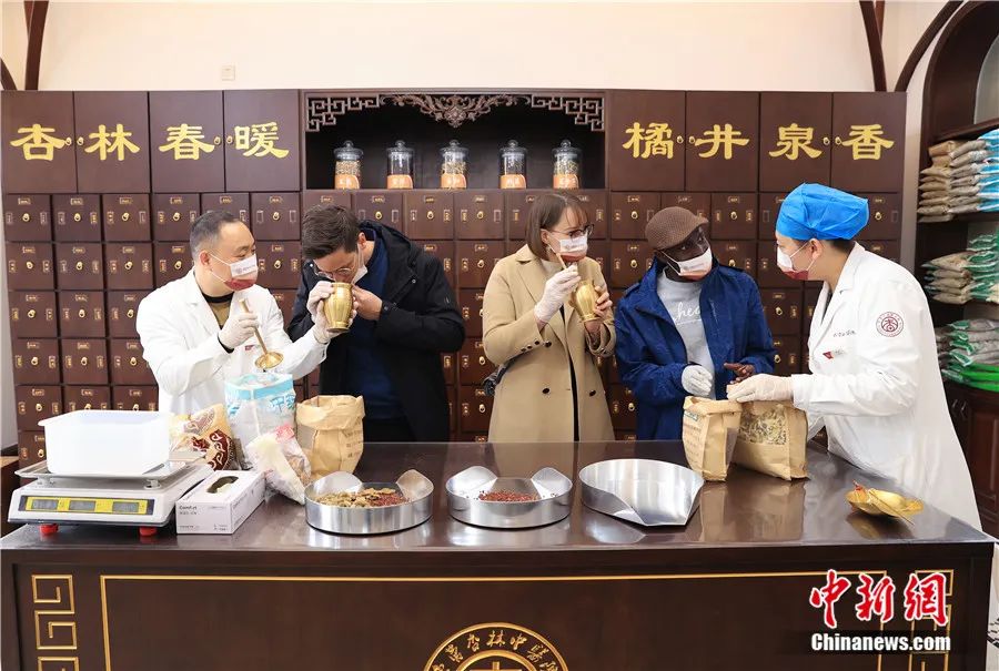 來自比利時、白俄羅斯和加納的外國友人在山東東營一家中醫(yī)醫(yī)院的中藥房識別、稱量中藥材。周廣學 攝