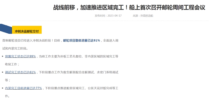 外高橋造船公布首艘國產(chǎn)大郵輪最新進(jìn)展情況。外高橋造船網(wǎng)站截圖