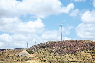 在南非北開普省德阿鎮(zhèn),中國龍源電力集團南非公司運營的德阿風電項目風機。