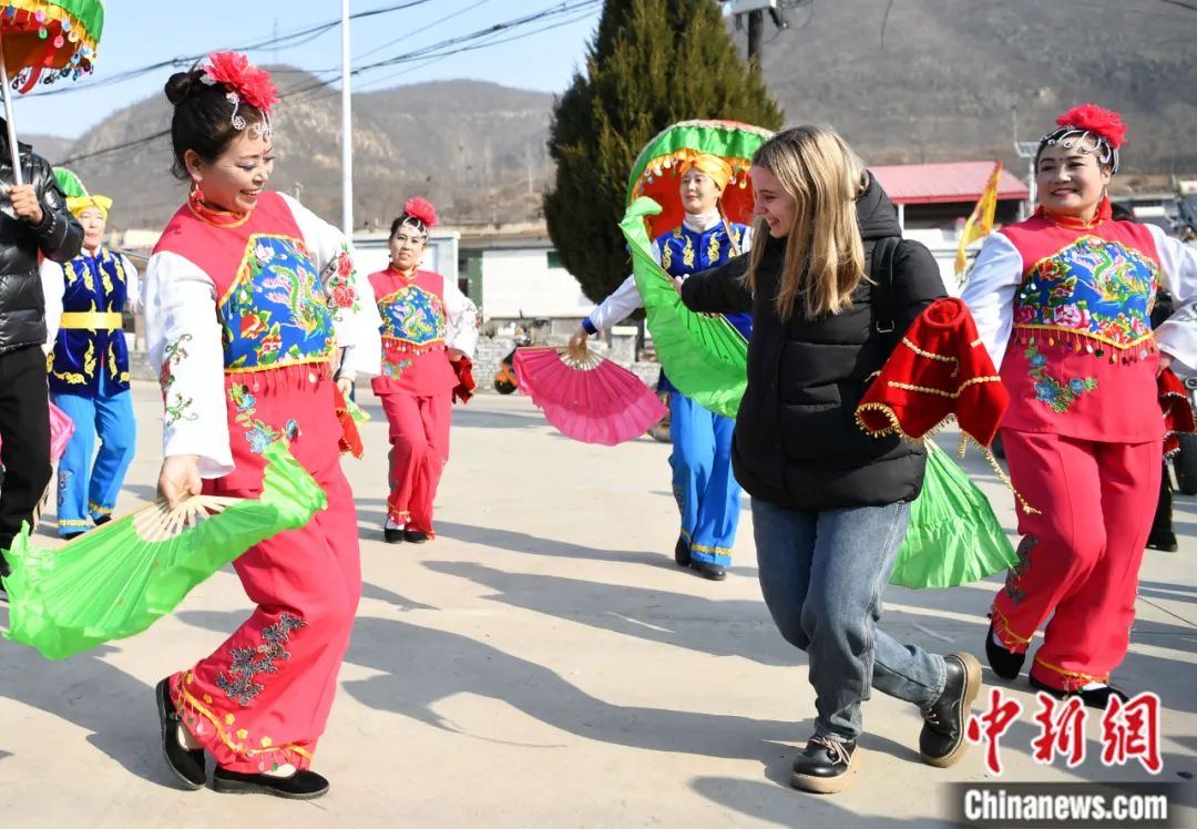 2023年2月,中國(guó)傳統(tǒng)節(jié)日元宵節(jié),河北省石家莊市井陘縣小作鎮(zhèn)桃林坪村,俄羅斯留學(xué)生曉燕(右二)體驗(yàn)非遺“井陘拉花”。翟羽佳 攝
