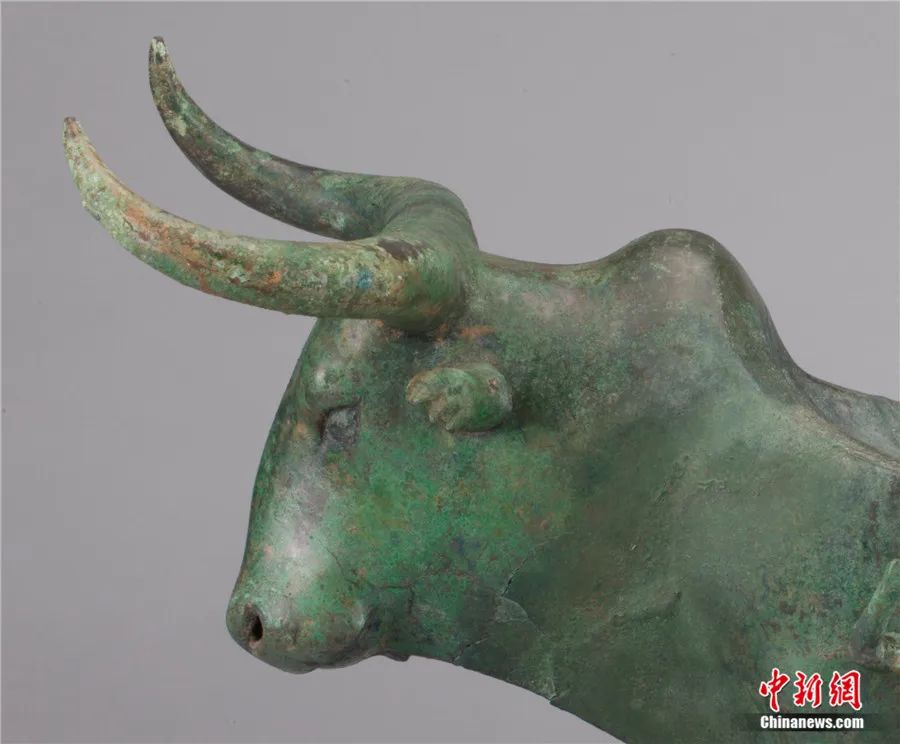 ?;~案的器物主體是一頭封牛,其特點(diǎn)在于兩邊牛角向內(nèi)彎曲,牛角尖向上翹起,牛脖子上有一個(gè)隆起部分,像駱駝的駝峰。封牛曾是亞洲的主要牛種之一,云南地區(qū)的封牛則通過(guò)有著“南方絲綢之路”之稱的蜀身毒道,從印度至緬甸,后進(jìn)入云南。這條交通要道促進(jìn)了滇國(guó)與其他文明在商貿(mào)、文化上的交流融合。