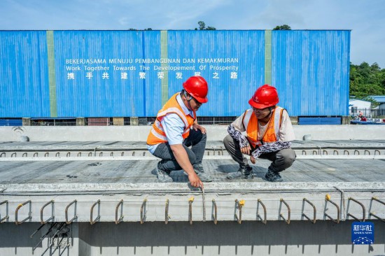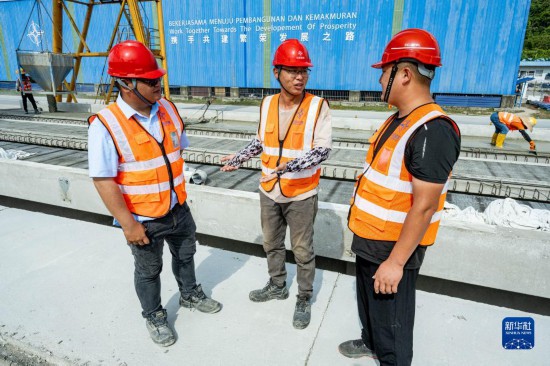 4月26日,在馬來西亞吉蘭丹州的馬東鐵項目一分部制梁場,技術(shù)主管鄧友志(右)和馬來西亞本地青年員工鄧德緯討論生產(chǎn)情況。五月初的馬來西亞烈日炎炎,中馬共建“一帶一路”的標(biāo)志性項目——馬來西亞東海岸鐵路(馬東鐵)建設(shè)如火如荼。十支由中馬兩國員工組成的青年突擊隊活躍在全長600多公里的馬東鐵沿線建設(shè)現(xiàn)場,用汗水和擔(dān)當(dāng)抒寫屬于這個時代的青春篇章。新華社記者 朱煒 攝