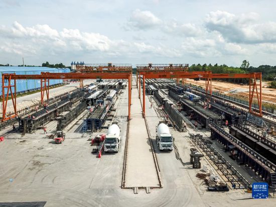 這是4月26日在馬來西亞吉蘭丹州拍攝的馬東鐵項目一分部制梁場(無人機拍攝)。新華社記者 朱煒 攝