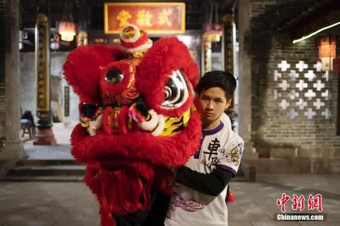 圖為2022年1月18日晚,廣州市天河區(qū)車陂龍獅體育會(huì)舞獅隊(duì)隊(duì)員王智銘在晴川蘇公祠拿著一頭紅獅。王智銘是一名“00后”,學(xué)習(xí)舞獅已3年,他說(shuō)自己的目標(biāo)是“世界獅王”。 中新社記者 陳楚紅 攝