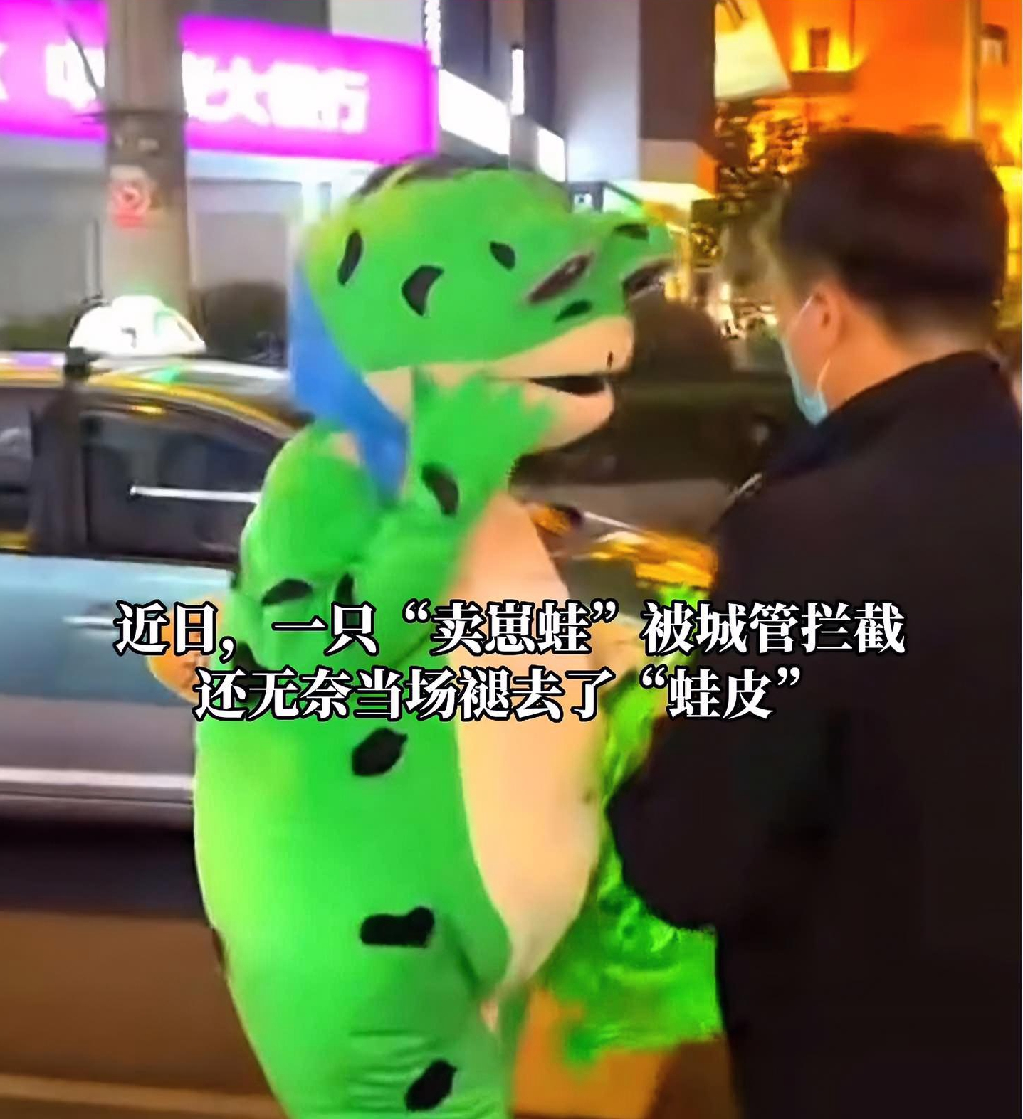 最近,“網(wǎng)紅賣崽青蛙上海落網(wǎng)”在網(wǎng)上引起熱議。在上海街頭,一只“賣崽青蛙”被城管攔截,還無奈當(dāng)場褪去了“蛙皮”。