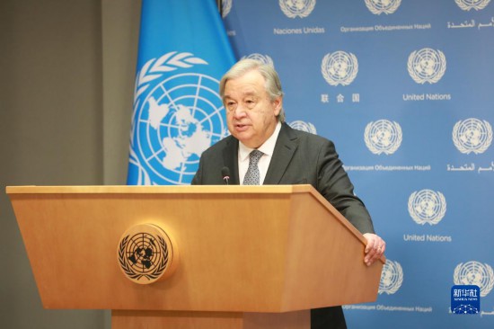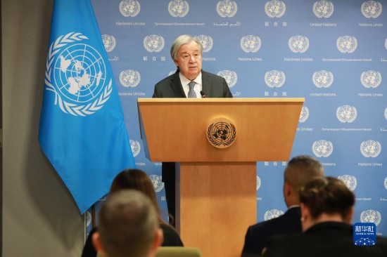 5月17日,在位于紐約的聯(lián)合國(guó)總部,聯(lián)合國(guó)秘書長(zhǎng)古特雷斯在記者會(huì)上講話。新華社記者謝鍔攝