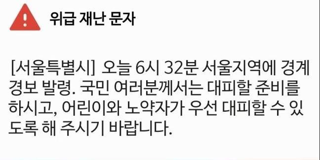 “今天6時32分首爾地區(qū)發(fā)布警戒警報。請各位國民做好躲避準(zhǔn)備,讓兒童和老弱者優(yōu)先躲避?!碑?dāng)天清晨,首爾市民收到這條危急災(zāi)害通知,手機同時響起警笛聲。