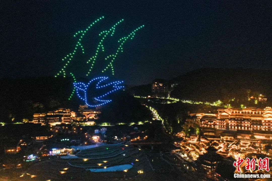 2022年6月,貴州省遵義市播州區(qū)烏江寨景區(qū)進(jìn)行無人機編隊表演。(無人機照片)瞿宏倫 攝