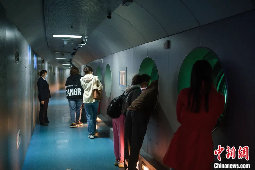 游客在白鶴梁水下博物館通過(guò)觀測(cè)窗口觀賞水下題刻。何蓬磊 攝