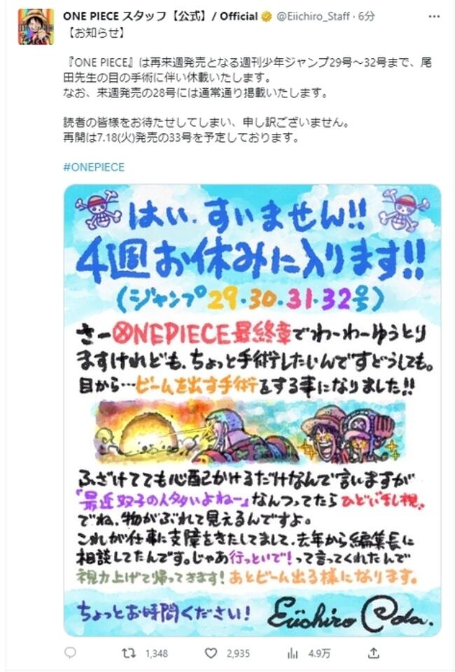 其官網(wǎng)還發(fā)布了尾田榮一郎在自己的手繪插畫上寫的“請假條”。他表示:“非常抱歉,我將休息四周時(shí)間?!逗胶M酢冯m然已經(jīng)進(jìn)入終章,但由于眼睛的散光很嚴(yán)重,看東西時(shí)出現(xiàn)重影,所以需要做個(gè)手術(shù)。請給我一些時(shí)間(修養(yǎng)一下)?!?/p>