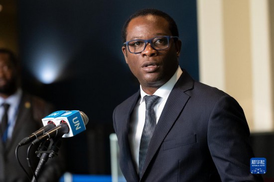 6月6日,在位于紐約的聯(lián)合國總部,塞拉利昂外交與國際合作部長弗朗西斯在塞拉利昂當選聯(lián)合國安理會非常任理事國后在記者見面會上講話。新華社發(fā)(聯(lián)合國供圖/洛伊·費利佩攝)