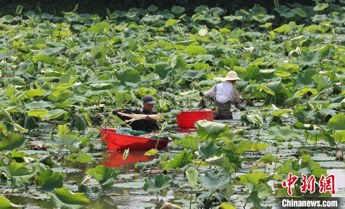5月23日,武漢蔡甸藕農(nóng)正在荷塘里“抽”藕帶?!≈行律缬浾?張暢 攝