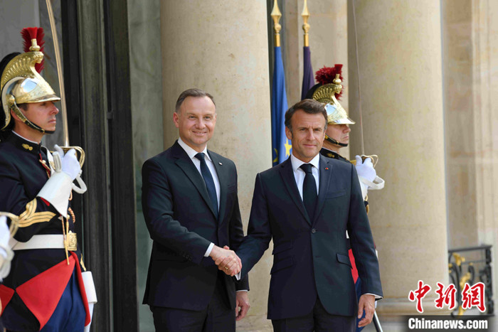 當?shù)貢r間6月12日晚,法國總統(tǒng)馬克龍在巴黎愛麗舍宮會見波蘭總統(tǒng)杜達。杜達前來出席當天舉行的法德波三國領導人會談。 中新社記者 李洋 攝