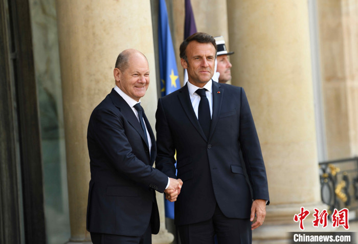 當?shù)貢r間6月12日晚,法國總統(tǒng)馬克龍在巴黎愛麗舍宮會見德國總理朔爾茨。朔爾茨前來出席當天舉行的法德波三國領導人會談。 中新社記者 李洋 攝