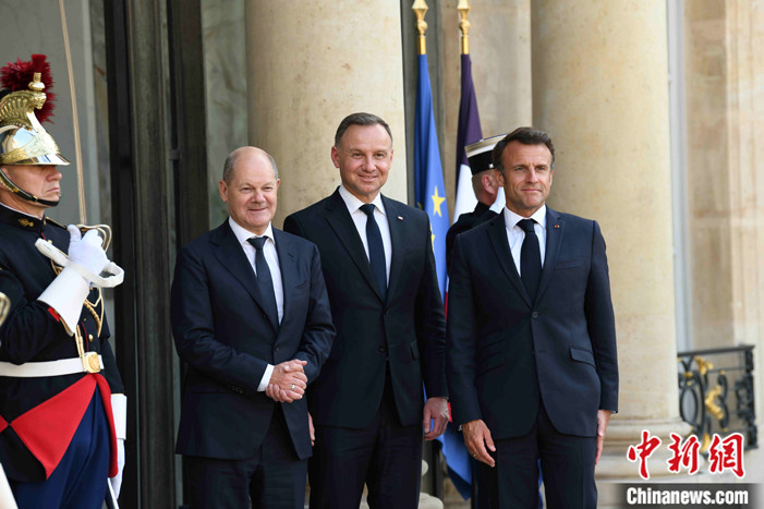 當?shù)貢r間6月12日晚,法國總統(tǒng)馬克龍在巴黎愛麗舍宮與德國總理朔爾茨、波蘭總統(tǒng)杜達會面。他們共同出席“魏瑪三角”機制下的三國領導人會議。 中新社記者 李洋 攝