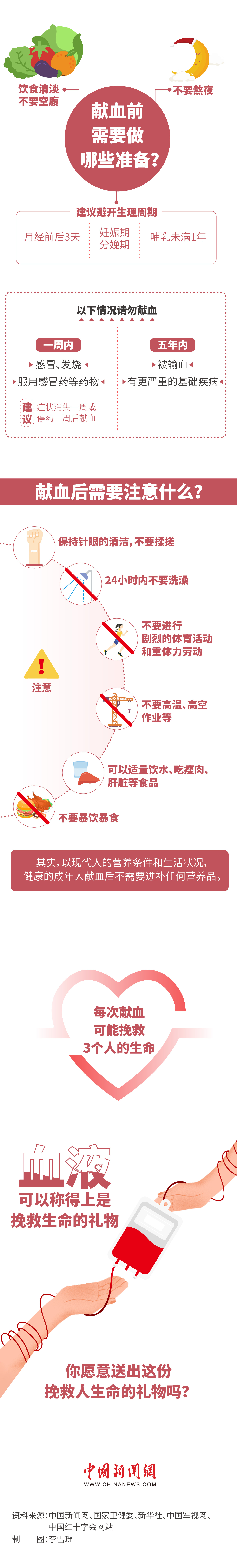 2023年6月14日是第20個“世界獻血者日”,一個成年人的身體里約有5000毫升血液,而捐獻200毫升血液,或許就可以挽救3個人的生命。那么獻血前需要做哪些準備?獻血究竟會不會對人體造成損害?戳圖帶你看懂獻血那些事兒↓↓↓