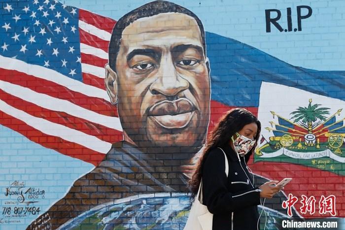 資料圖:美國(guó)紐約布魯克林區(qū)一位市民走過弗洛伊德畫像。 中新社記者 廖攀 攝