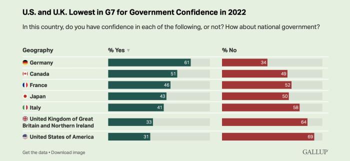 據(jù)《國(guó)會(huì)山報(bào)》當(dāng)?shù)貢r(shí)間7月3日?qǐng)?bào)道,根據(jù)蓋洛普最新發(fā)布的一項(xiàng)針對(duì)七國(guó)集團(tuán)政府信心指數(shù)的民意調(diào)查顯示,美國(guó)和英國(guó)獲得的信心指數(shù)最低。