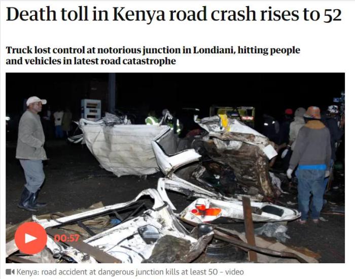 中新網(wǎng)7月2日電 綜合外媒報道,當(dāng)?shù)貢r間6月30日,肯尼亞西部發(fā)生近年來最嚴重車禍,一輛載有集裝箱的卡車“失控”,撞向多輛汽車和附近人群。截至7月1日,遇難人數(shù)已升至50余人。