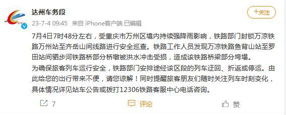 中新網(wǎng)7月4日電 據(jù)成都鐵路局達(dá)州車(chē)務(wù)段官方微博消息,7月4日7時(shí)48分左右,受重慶市萬(wàn)州區(qū)境內(nèi)持續(xù)強(qiáng)降雨影響,鐵路部門(mén)封鎖萬(wàn)涼鐵路萬(wàn)州站至齊岳山間線(xiàn)路進(jìn)行安全巡查。鐵路工作人員發(fā)現(xiàn)萬(wàn)涼鐵路魚(yú)背山站至羅田站間駟步河鐵路橋部分橋墩被洪水沖擊受損,造成該鐵路橋梁部分垮塌。為確保旅客列車(chē)運(yùn)行安全,鐵路部門(mén)安排途經(jīng)該區(qū)段的列車(chē)迂回、折返或停運(yùn)。