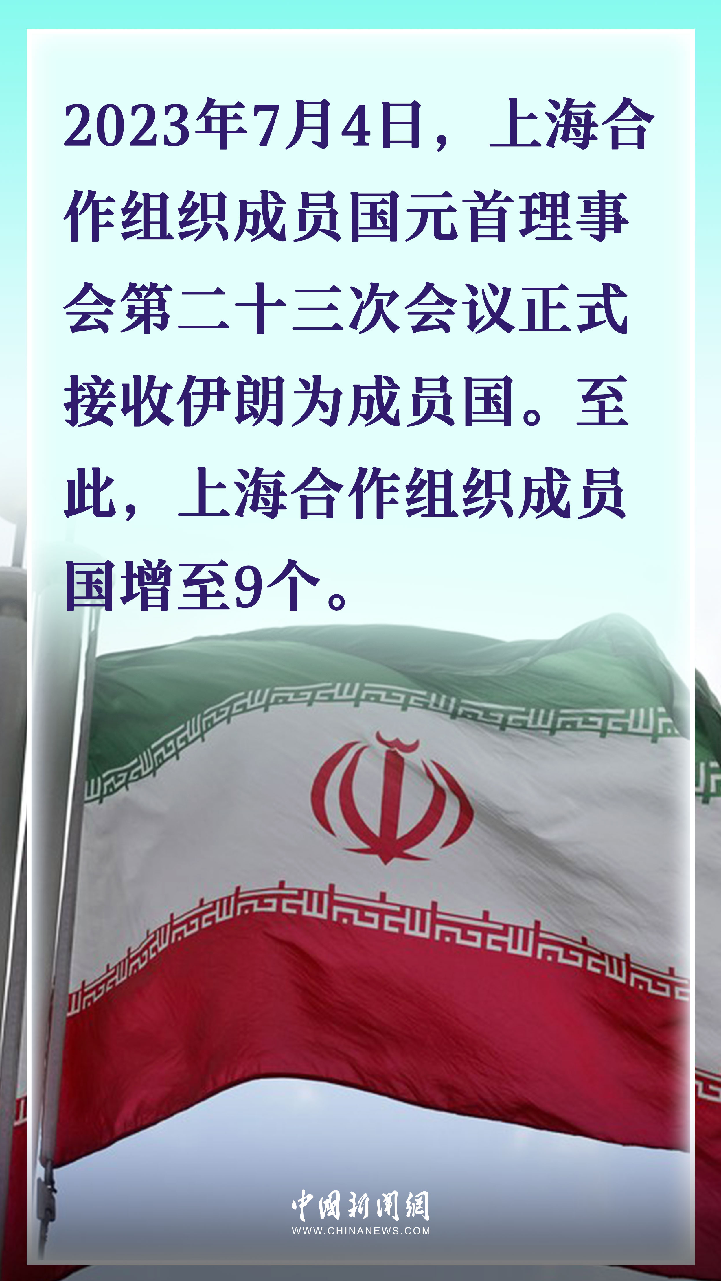 上合組織成立于2001年,創(chuàng)始成員國(guó)為中國(guó)、俄羅斯、哈薩克斯坦、吉爾吉斯斯坦、塔吉克斯坦和烏茲別克斯坦6國(guó)。隨著時(shí)間推移,上合“朋友圈”不斷擴(kuò)容。2017年,上合組織給予印度和巴基斯坦成員國(guó)地位。2023年7月4日,上合組織再次注入“新鮮血液”,伊朗被正式接受為第9個(gè)成員國(guó)。