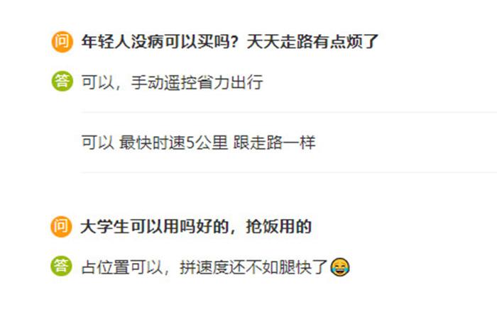 中新財經(jīng)注意到,在電商平臺上電動輪椅的問答區(qū),不少消費(fèi)者都對電動輪椅展現(xiàn)出了濃厚的興趣,“年輕人沒病可以買嗎?天天走路有點(diǎn)煩了?!薄按髮W(xué)生可以用嗎?”“食堂搶飯用!神器。”“年輕人也可以用,省力出行?!?/p>