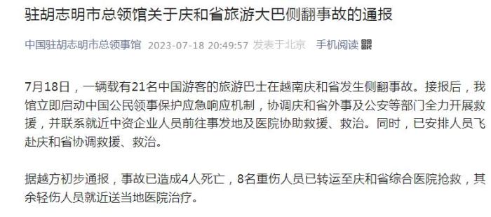 中新網7月18日電 據中國駐胡志明市總領事館微信公眾號18日消息,7月18日,一輛載有21名中國游客的旅游巴士在越南慶和省發(fā)生側翻事故。