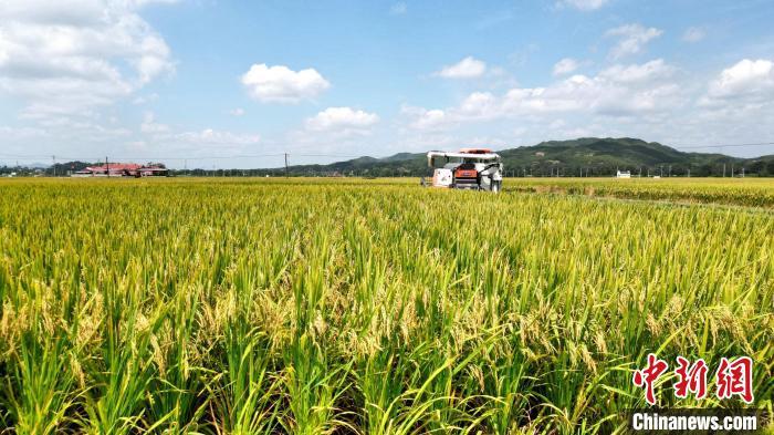 中新網(wǎng)福建長汀7月17日電 (朱芳彬 丘偉華)眼下,位于福建省龍巖市長汀縣河田鎮(zhèn)的遠(yuǎn)豐優(yōu)質(zhì)稻生產(chǎn)基地又迎來豐收,基地里的水稻陸續(xù)成熟進入收割期,機械化按下開鐮收割夏收“快進鍵”。