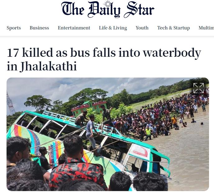 據(jù)報(bào)道,當(dāng)?shù)貢r(shí)間22日上午約9:45分,在達(dá)卡以南約200公里的恰洛加蒂縣,一輛大巴掉入水中。當(dāng)?shù)鼐椒Q,死者中包括至少8名婦女和3名兒童。