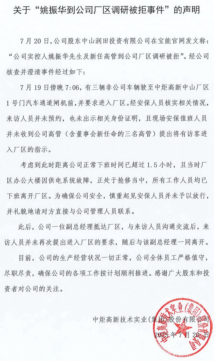 近日,“寶能系”股東中山潤田在寶能集團(tuán)官網(wǎng)發(fā)布聲明稱,寶能集團(tuán)董事長姚振華得知中炬高新日常管理工作出現(xiàn)重大紕漏的相關(guān)情況后,非常擔(dān)憂上市公司的生產(chǎn)安全及食品安全問題,趕往中山中炬高新總部,調(diào)研生產(chǎn)經(jīng)營情況。未曾想,竟被保安拒絕進(jìn)入。