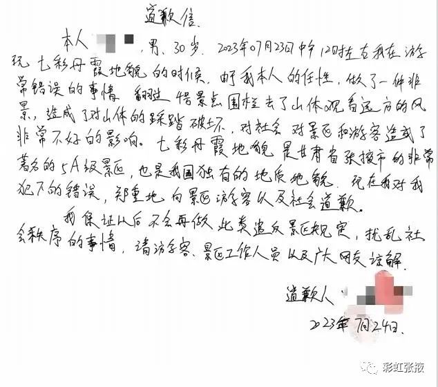 通報表示,該游客進入?yún)^(qū)域是張掖世界地質(zhì)公園彩色丘陵保護范圍,雖然因其行走的山脊被黃土覆蓋,未造成實質(zhì)性損害,但其行為違反了《張掖七彩丹霞保護條例》和《治安管理處罰法》相關(guān)規(guī)定。7月24日16:50該游客從旅游途中返回臨澤縣,接受相關(guān)部門調(diào)查處理。市、縣林草部門對該游客進行了嚴肅的批評教育;丹霞景區(qū)派出所依據(jù)《治安管理處罰法》對該游客處以200元罰款;該游客深刻認識到自身行為的錯誤性和嚴重性,并公開致歉。