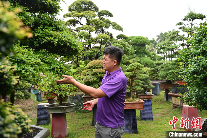 圖為7月18日,廣東佛山,王俞又在嘉盛園藝總場介紹盆景養(yǎng)護技巧。 中新社記者 陳楚紅 攝