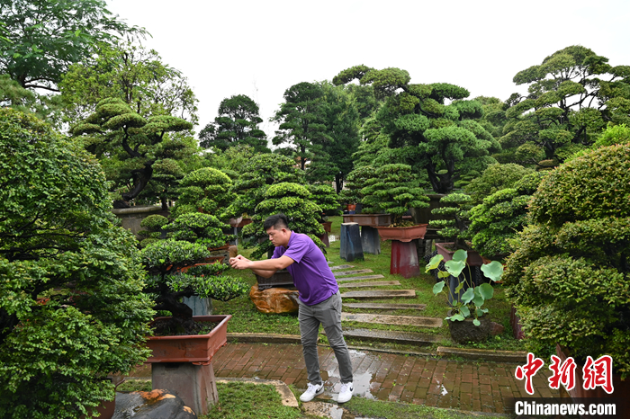 圖為7月18日,廣東佛山,王俞又在嘉盛園藝總場查看盆景長勢。 中新社記者 陳楚紅 攝