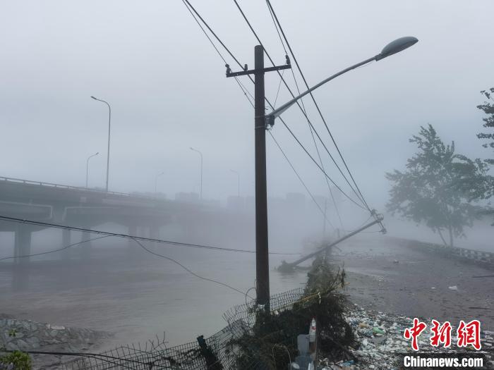 8月1日下午,在永定河京原漫水橋現(xiàn)場,武警北京總隊機(jī)動第三支隊200名官兵正在此處實施封堵作業(yè),以防止洪水漫溢,影響周邊百姓。圖為京原漫水橋上的一根電線桿已被洪流沖歪,各種雜物散落各處。中新社記者 劉亮 攝