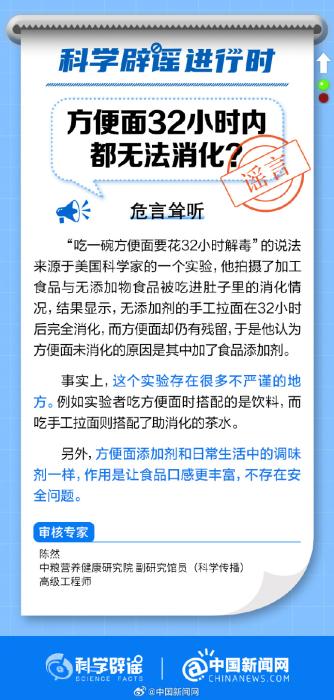 中新網(wǎng)8月1日電 “吃一碗方便面要花32小時解毒”的說法來源于美國科學(xué)家的一個實驗,但這個實驗存在很多不嚴(yán)謹(jǐn)?shù)牡胤健7奖忝嫣砑觿┖腿粘I钪械恼{(diào)味劑一樣,作用是讓食品口感更豐富,不存在安全問題。(來源:@科學(xué)辟謠 @中國新聞網(wǎng) )