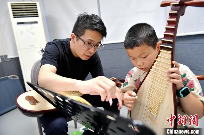 中新網(wǎng)福州8月2日電 (葉秋云)“左手大拇指不要太靠后”“手移動(dòng)的時(shí)候,手臂要跟著移動(dòng),彈的時(shí)候才不會(huì)怪怪的”……從演奏姿勢(shì)、轉(zhuǎn)腕到手指的彈挑,魏辰運(yùn)手把手指導(dǎo)著一位8歲小男孩彈琵琶。