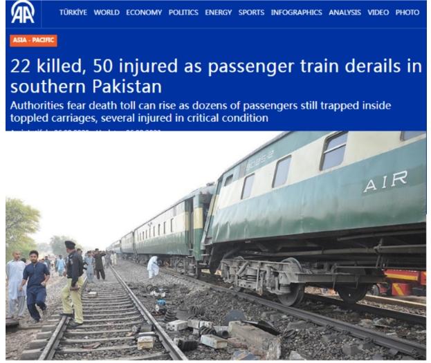 巴基斯坦鐵路系統(tǒng)經常發(fā)生火車脫軌事故。2021年,信德省曾發(fā)生兩列客運列車相撞事故,造成至少51人死亡,100余人受傷。