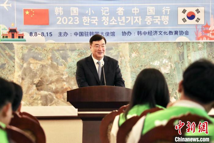 8日,“2023韓國小記者中國行”活動(dòng)在首爾舉行啟程儀式。圖為中國駐韓國大使邢海明致辭。中國駐韓國大使館供圖