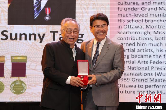 7日,國際武術(shù)聯(lián)合會執(zhí)行委員、加拿大武術(shù)團(tuán)體聯(lián)合總會會長鄧華(左)獲頒國際武術(shù)功夫名人堂勛章。中新社記者 余瑞冬 攝