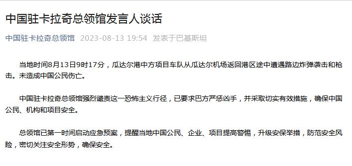 中新網(wǎng)8月13日電 據(jù)中國駐卡拉奇總領(lǐng)館微信公眾號消息,當(dāng)?shù)貢r間8月13日9時17分,瓜達(dá)爾港中方項目車隊從瓜達(dá)爾機(jī)場返回港區(qū)途中遭遇路邊炸彈襲擊和槍擊。未造成中國公民傷亡。