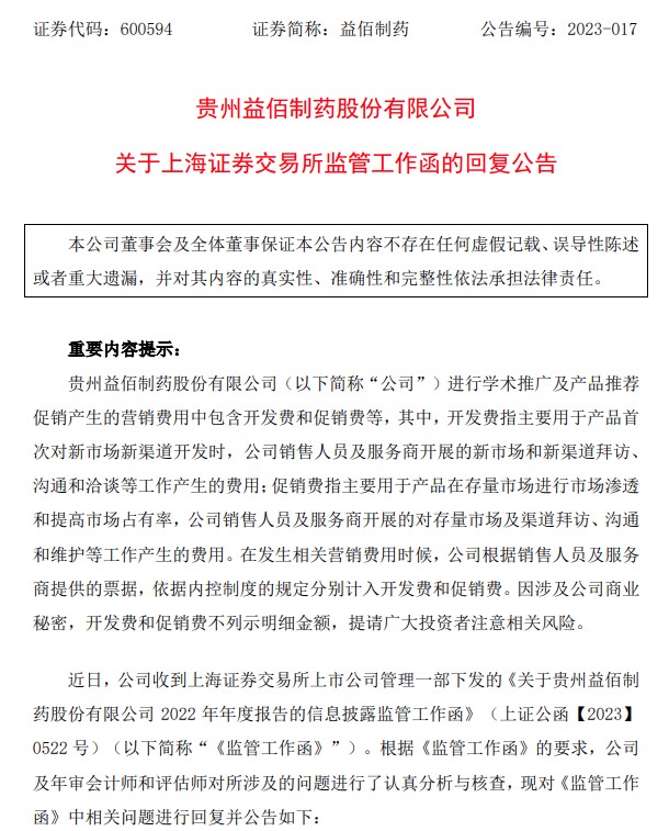 2023年6月,益佰制藥收到上交所年報(bào)監(jiān)管函,被要求補(bǔ)充披露銷售費(fèi)用前五大支付對(duì)象;學(xué)術(shù)推廣、營(yíng)銷平臺(tái)建設(shè)等市場(chǎng)費(fèi)用主要核算內(nèi)容明細(xì)情況;銷售費(fèi)用支付對(duì)象中是否涉及公司經(jīng)銷商、關(guān)聯(lián)方或其他利益相關(guān)方等相關(guān)信息。