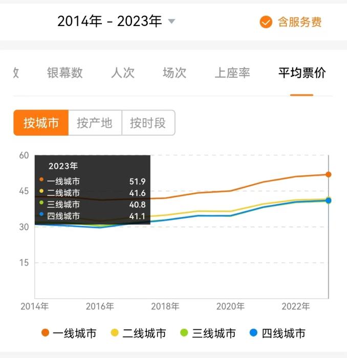 另外,相較二三四線城市,一線城市票價(jià)明顯較貴。繼2022年沖上50元大關(guān)后,2023年,一線城市平均票價(jià)達(dá)到51.9元,二三四線城市近兩年則漲至40元以上。