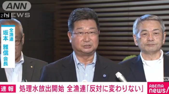 當(dāng)?shù)貢r(shí)間24日下午,針對福島核污染水被正式排入大海,日本全國漁業(yè)協(xié)會聯(lián)合會(全漁聯(lián))表示:“反對核污染水排海的立場,沒有絲毫改變”。圖片來源:日本朝日電視臺視頻截圖