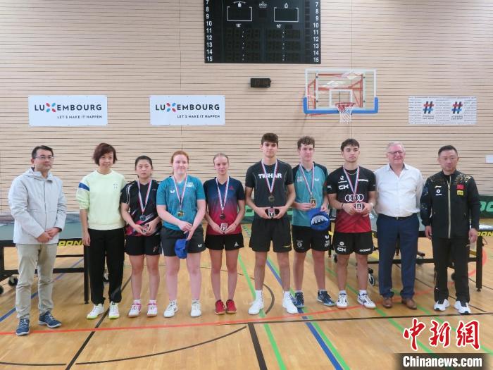 中國駐盧森堡大使華寧(左一)、奧運冠軍張怡寧(左二)、閻森(右一)等與參加青年集訓營的選手合影留念。中新網(wǎng)發(fā) 中國駐盧森堡使館供圖