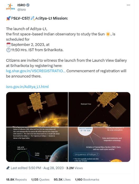 報道稱,作為印度首個專門研究太陽的任務,“太陽神-L1號”(Aditya-L1)將成為印度空間研究組織新的里程碑。
