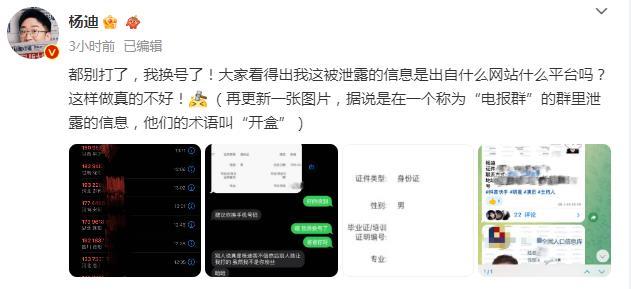 中新網(wǎng)北京9月4日電 今天,#楊迪信息被泄露#登上熱搜。從楊迪在微博上曬出的圖可以看到,他的電話(huà)已經(jīng)被打爆,無(wú)奈之下只能換手機(jī)號(hào)。