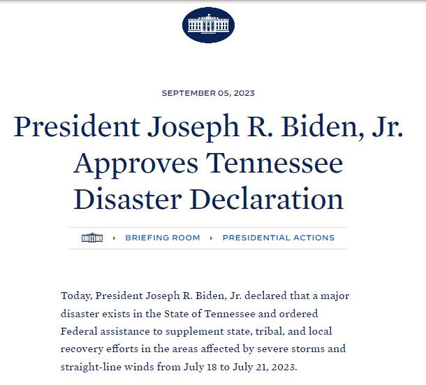 中新網9月6日電 據白宮官網消息,當地時間9月5日,美國總統(tǒng)拜登批準田納西州重大災難聲明,并下令為田納西州從7月18日開始至7月21日期間受風暴影響的地區(qū)提供聯(lián)邦援助。