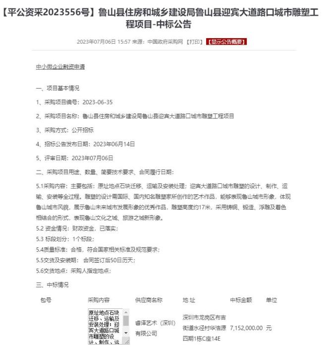 中國政府采購網(wǎng)公開的中標(biāo)公告顯示,這座位于魯山縣迎賓大道路口城市雕塑工程項(xiàng)目,中標(biāo)金額達(dá)到715.2萬元,資金情況為“財(cái)政資金,已落實(shí)”。
