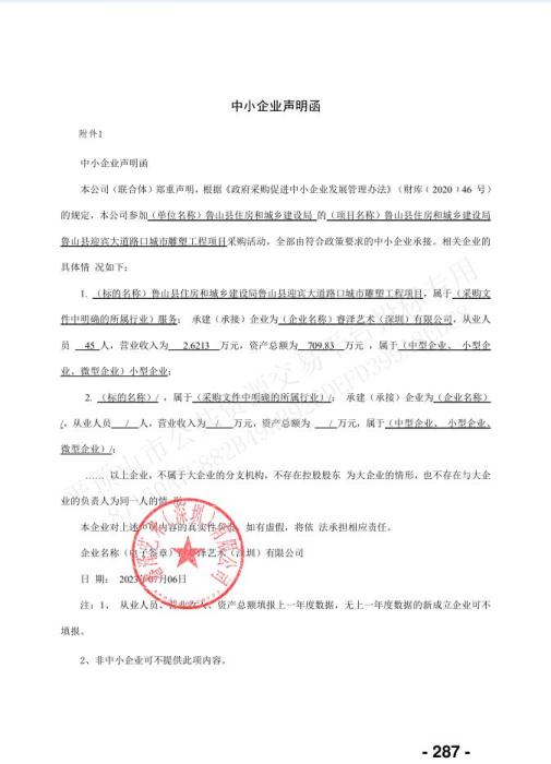 中標(biāo)公告所附的中小企業(yè)聲明函顯示,睿澤藝術(shù)(深圳)有限公司從業(yè)人員45人,營業(yè)收入2.6213萬元,資產(chǎn)總額為709.83萬元。